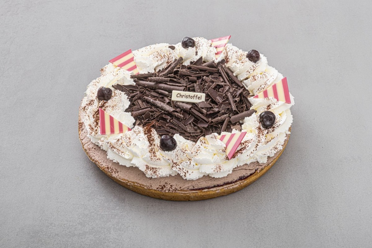 Limburgse Roombodem vlaai, gevuld met pitloze kersen en afgewerkt met chocolade bavaroise, slagroom en chocolade snippers. Een fruitige en chocolade smaakbeleving.